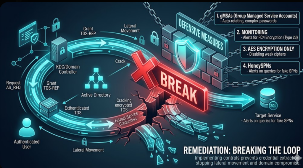 Phase 1: Initial Foothold The attacker starts with a low-privileged domain user account (e.g., via phishing, credential stuffing, or an initial compromise). No admin rights are needed just a valid domain credential as this is the assumed breach scenario. With a foothold, the attacker can now interact with the Kerberos Key Distribution Center (KDC) on the domain controller.